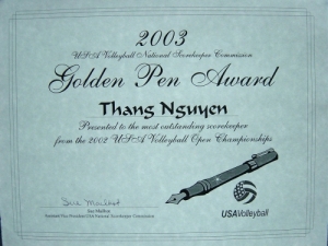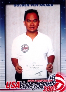 is about 20 minutes south of Houston. Nguyen's first experience to volleyball officiating began in the fall of 1994 when a local junior college coach, Galveston College, asked him to come out and keep score for a tournament. He showed up courtside and the coach put the scoresheets down in front of him. He thought keeping score was just flipping the score or working the scoreboard. He had no idea as to what a scoresheet was or how to use one either. With the help of one of the referees assigned to the match, Rich Richardson, he was given a "crash" course in scorekeeping and had on the job training for the remainder of the tournament and has been keeping score ever since. Nguyen joined the Lone Star Region of USVBA in 1995. He has played on several mens teams with varying levels of play; anywhere from B, BB, and A. He only got USAV certified to fulfill a region requirement that every region team had to have at least one certified referee and one certified scorekeeper per team. He's been active in the local Houston boys club volleyball scene as well starting with Club Texas Boys, South Shore VBC, and currently Houston Volleyball Academy. He was keeping score for a match at the same junior college around late 1996 when a referee unknown to him at the time came up and said, " So when are you going to come to one of my clinics to get certified?" He replied by saying, " Certify? I already know how to keep score." The referee turned out to be Steve Crane, Lone Star Region Scorekeeper Chairman, National Commissioner RVA Scorekeeper Development, and the 2003 Lauten Scorekeeper Service Award Winner. This put things in motion as Thang received his Provisional Scorekeeper in 1997, Regional Scorekeeper in 1998, and Jr. National Scorekeeper rating in 1998 at the JO's in Dallas. In 1999, he was asked to go get his USA National Scorekeeper rating in San Jose, Ca. at the Open Championships. He's very grateful in having such experienced raters along the way including Dixie Collins, Jeff Hoppen, Dee Yoe, and JoAnn Peters for his JN. Also his raters/mentors for his National were Dixie Collins, Cathy Hoy, Terry Lawton, and Kim Williams. In 2001 at the Opens in Milwaukee, he was qualified as an International Indoor Scorekeeper. He attained his USA National Outdoor Scorekeeper rating at the USA Open Beach Championships in Virginia Beach, Va. the same year. Along his volleyball officiating path, he has also picked up some referee ratings. He was certified as a USA Jr. National Referee in 2001, USA Certified Beach Referee in 2001, and a PAVO National Referee in 2002. He had plenty of help from many Nationals within the region: Thomas Hoy, Joe Campbell, John Kimmel, Gloria Cox, Fred Buehler, Mary Blalock, Ted Lopez, Gordon Morrison, Carlos Rodriguez, Ronnie Kaase, Dale Young, Linda Fletcher, Eric Houston, and Will Vick. Nguyen is active in the Lone Star Region. Since 1999, he has mentored and trained members as a clinician and rater. He has served as a tournament director, head referee, and official's assignor. He did some local jr. college assigning for 2 years. He is currently the assignor for the Houston area private school boys league. He has been active in every USAV Championships since 1999 as a scorekeeper at the Opens and a scorekeeper monitor for Sue Mailhot and referee at the Jr. Nationals. Nguyen's achievements include being an official at the World Police and Fire Games in Indianapolis, Indiana, in 2001; scorekeeper, USA Men vs. Australia Tour in Louisville, Kentucky in 2002; scorekeeper, USA Men vs. Canada Tour in Louisville, Kentucky in 2002; scorekeeper, USA Men vs. Italy Tour in Ft. Lauderdale, Florida in 2002 before the team went to the World Championships in Argentina; and being asked to be on the National Rating Team for scorekeepers at the Minneapolis Opens in 2003. Additionally, Nguyen keeps score and line judges at Rice University and on occasion at the University of Houston. He currently officiates in the Southland Conference. He was selected as a referee for a NAIA Regional and NJCAA District Tournament. He would like to thank his region for sending him to get his certification, all the officials who nominated him at the Dallas Opens in 2002, and to the USA National Scorekeeper Commission for presenting him with the first ever inaugural Golden Pen Award. |