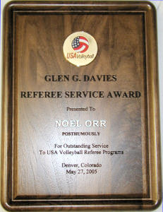 outstanding contributions to the Named in honor of Glen G. Davies, who at the time of this conferral by the Board of Directors, was the only FIVB international arbiter to have been selected to officiate as a referee in four consecutive Olympic Games (1968-1980) and twice as the first referee in a gold-medal match. |